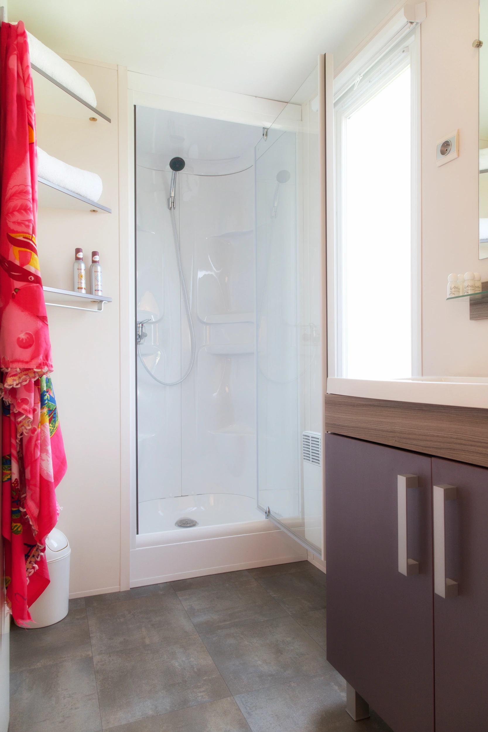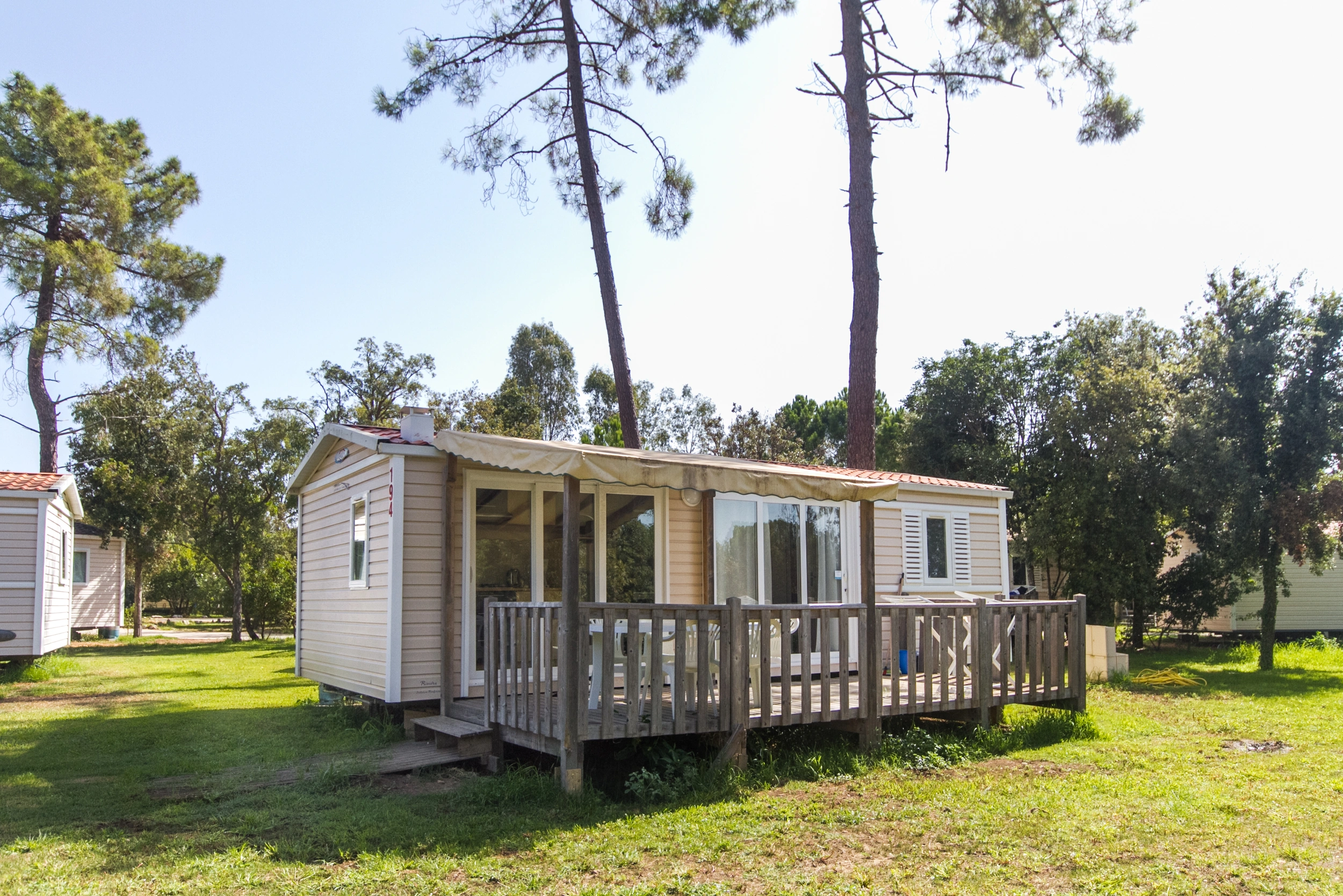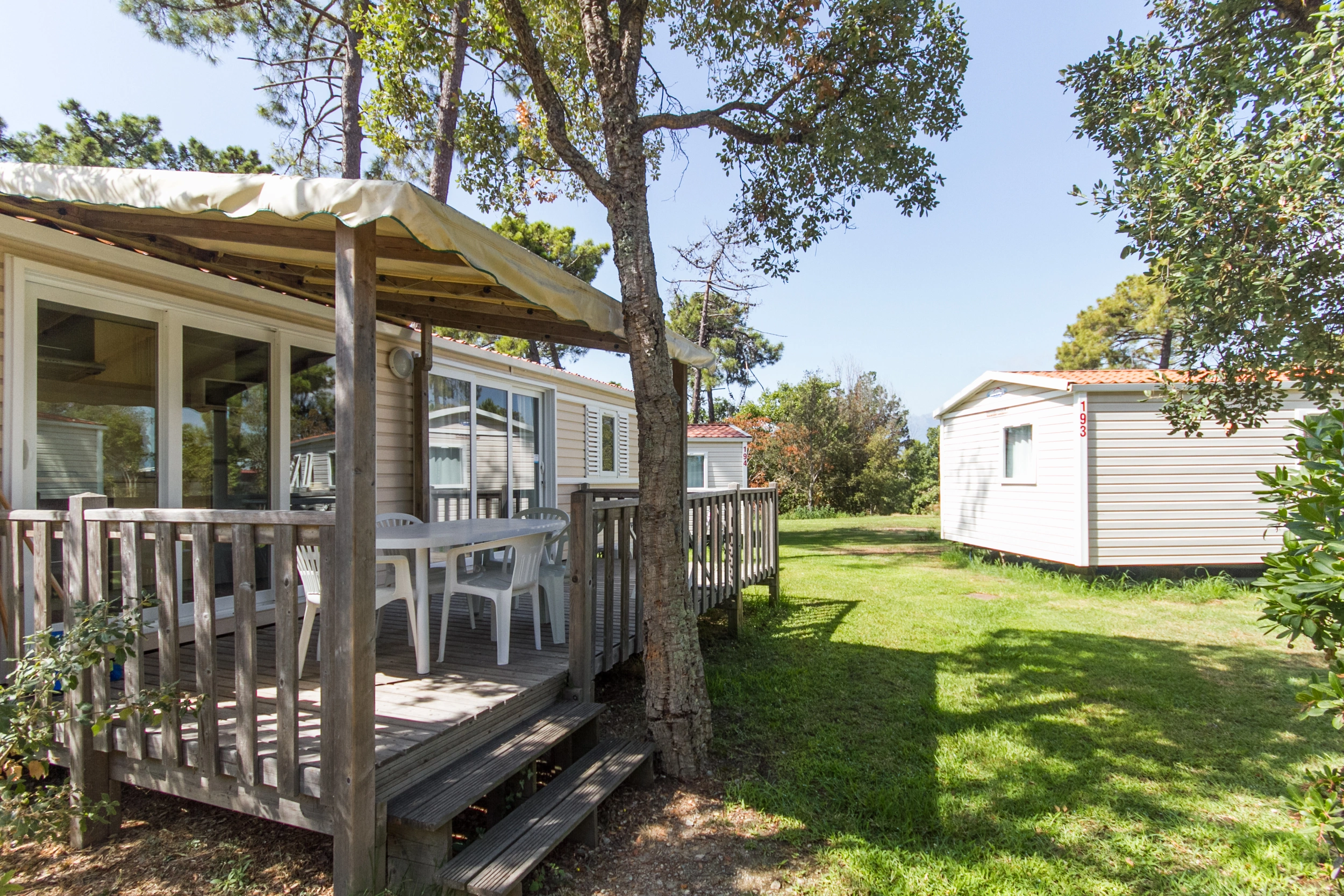 En plus de son confortable séjour de grande superficie, le Cottage Muredda dispose d’une terrasse de 13 m2 avec deux chiliennes : un vaste espace extérieur qui prolonge votre logement pour vous offrir encore davantage d’espace à vivre. Surélevée et en bois, cette terrasse est au même niveau que les pièces de votre mobil-home. Elle est accessible de l’extérieur par quelques marches et sécurisée par des rambardes de bois. Charmante, votre terrasse de vacances couverte est un véritable écrin ombragé où vous détendre en famille, au cours des repas ou à n’importe quel moment de la journée. Au cœur d’un parc paysager, avec vue sur un environnement arboré et fleuri, la terrasse du Cottage Muredda vous garantit des vacances ressourçantes et sereines, au cours desquelles vous pourrez profiter de manière optimale du grand air.