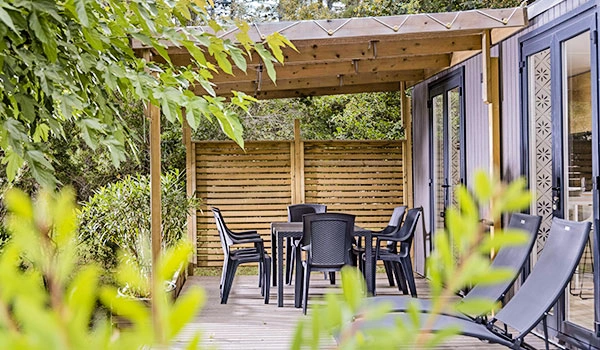Il Cottage Urbino è dotato di una terrazza privata di 18 m² per le vostre vacanze sotto il sole della Corsica. Godetevi al massimo il vostro soggiorno all'aria aperta al campeggio Perla di mare. Un alloggio spazioso, intimo e confortevole è pronto ad accogliervi. La terrazza comprende una parte non ombreggiata con un Spa per godersi il sole e una zona riparata per rilassarsi all'ombra. Una graziosa balaustra funge da protezione e conferisce un tocco di intimità alla terrazza. Un completo set da giardino vi aspetta per un momento di relax in famiglia mentre i bambini si divertono sull'ampia terrazza di 18 m². La terrazza è un'estensione all'aperto di questa sistemazione per le vacanze in Corsica, mentre la grande vetrata che si affaccia sul soggiorno aggiunge un tocco di design unico.