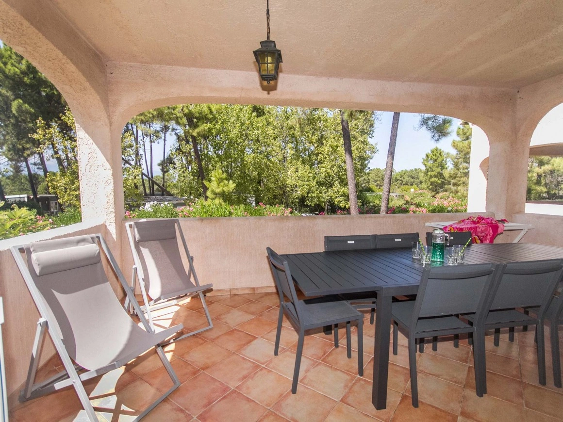 La villa T4 dispose également d’une terrasse remarquable avec vue sur les montagnes. Couverte et d’une superficie de 16 m², elle est aménagée avec un salon de jardin et offre une vue dégagée sur le parc paysager du Perla di Mare. Pensée comme un véritable espace de confort supplémentaire, elle se prête à toutes les heures de la journée grâce à sa configuration qui protège du soleil, du vent et des regards extérieurs. Vous y apprécierez son atmosphère intime et conviviale, idéale pour vous ressourcer ou partager une soirée entre amis. Son éclairage extérieur permet d’en profiter pleinement, même tard le soir en été, ou de prendre vos repas dehors hors saison. Cette terrasse loggia devient ainsi un lieu chaleureux où il fait bon se retrouver autour d’une grande table pour savourer grillades et salades composées.