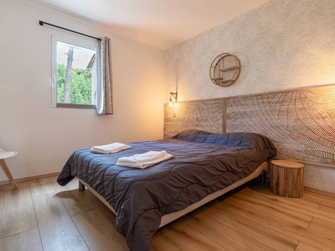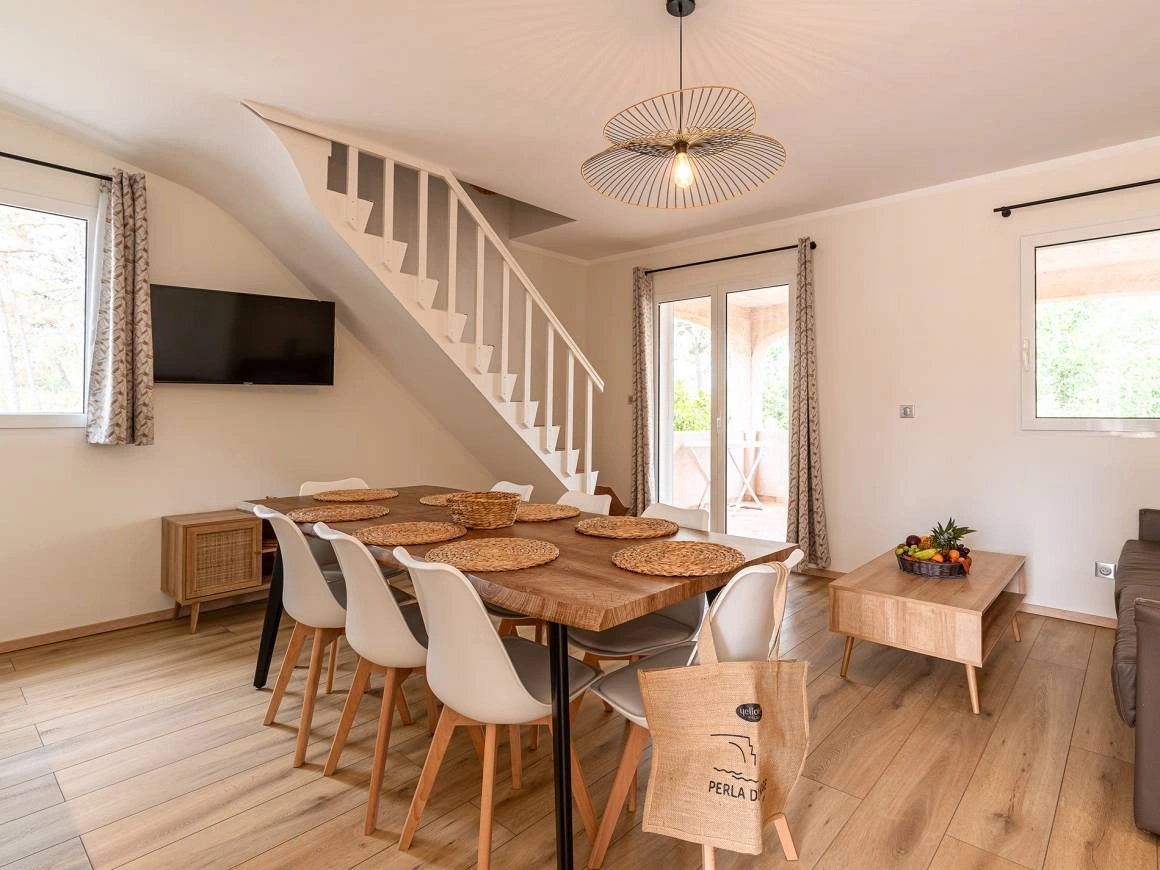 Remarquable par ses dimensions et ses équipements, la villa T4 offre 120 m² d’espace intérieur, idéale pour des vacances en Corse en famille ou entre amis, de 6 à 9 personnes. Spacieuse et confortable, elle dispose de trois grandes chambres aménagées avec des lits doubles et simples, ainsi que d’un séjour équipé d’un canapé-lit. Sa configuration en duplex permet de profiter d’une véritable suite parentale à l’étage, comprenant une vaste chambre, une seconde salle d’eau et des WC indépendants. Cette chambre fermée à l’étage est dotée d’un lit double, tandis qu’un lit simple installé sur la mezzanine offre une parfaite autonomie, idéale pour un deuxième couple avec enfant. Au rez-de-chaussée se trouvent le séjour, la cuisine, deux chambres, une salle de bain et des WC séparés. Conçue pour garantir un confort optimal, la villa dispose d’une literie de qualité avec des lits en 160 cm, d’un mobilier élégant et d’équipements haut de gamme tels que la climatisation, un coffre-fort, un lave-vaisselle, une hotte aspirante et un téléviseur.